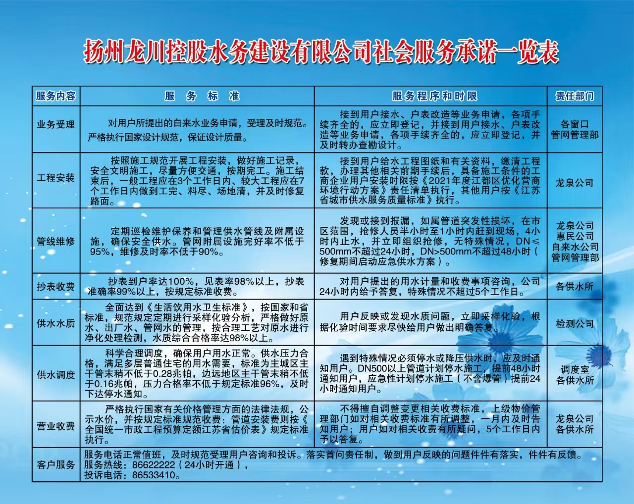 揚州龍川控股水務建設有限公司社會服務承諾一覽表