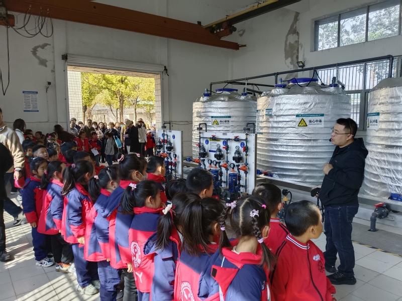 第二水廠廠長(zhǎng)許明同志和葉欣大班長(zhǎng)帶領(lǐng)小朋友們沿著水流的方向展開(kāi)探索,生動(dòng)有趣地向小朋友們介紹了水的處理流程,講解制水工藝。當(dāng)看到渾濁的原水經(jīng)過(guò)層層處理后變得清澈透明,小朋友們對(duì)河水變成自來(lái)水的過(guò)程有了一定的認(rèn)知,讓小朋友們真真切切地感受到每一滴水的來(lái)之不易。